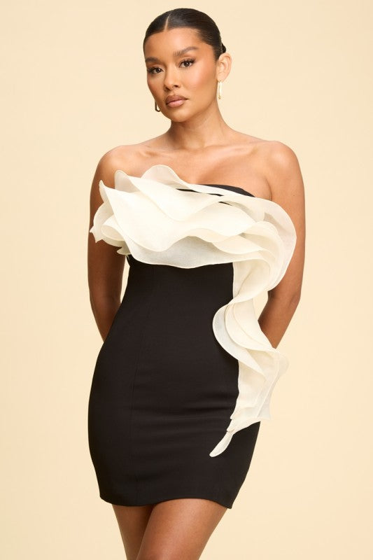 Make a bold entrance with the Sculptura Noir Dress, a strapless mini dress designed to embody elegance, art, and allure. Crafted in classic black, this figure-hugging silhouette is elevated by a dramatic ivory organza ruffle cascading across the front, creating a sculptural effect that’s both modern and timeless. The clean, strapless back adds sophistication and sensuality, while the mini length highlights your legs for a confident, striking look.