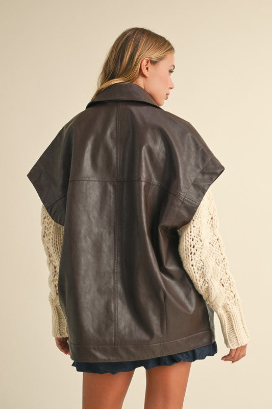 The Mocha Edge Oversized Vest brings modern sophistication to your fall layering game. Crafted from luxe faux leather in a deep mocha tone, it features structured shoulders, wide sleeves, and a relaxed silhouette that drapes effortlessly. With its button-up front and smooth finish, this piece perfectly balances edgy and refined.