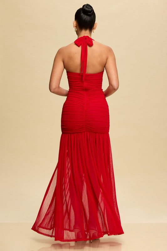 Ignite the night with the Scarlet Flame Gown, a striking halter-style gown designed for elegance and allure. Crafted with a ruched bodice that sculpts the figure, this gown accentuates your curves while maintaining timeless sophistication.